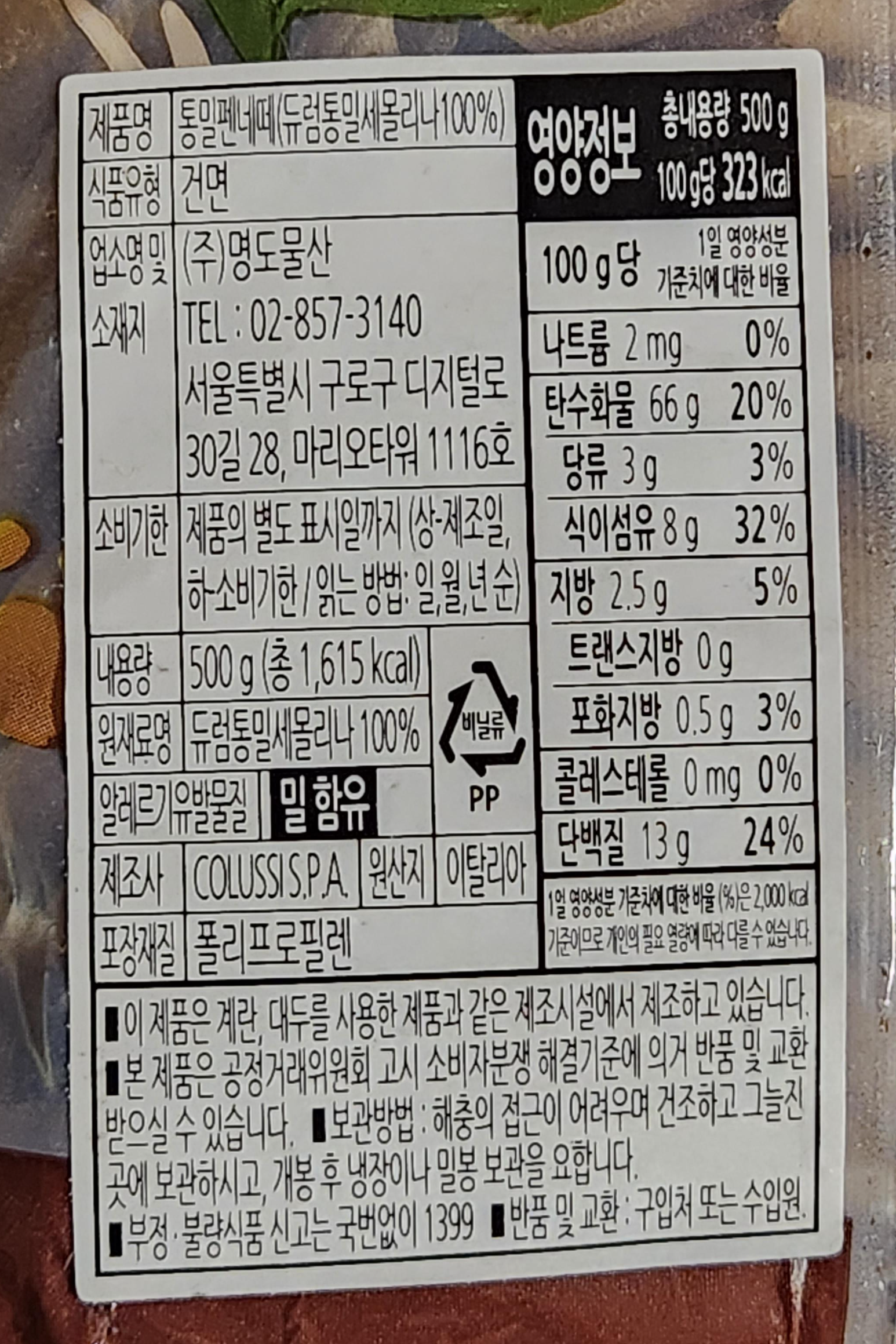 미주라 통밀펜네 파스타 성분표 분석 및 타 파스타면과 성분 비교