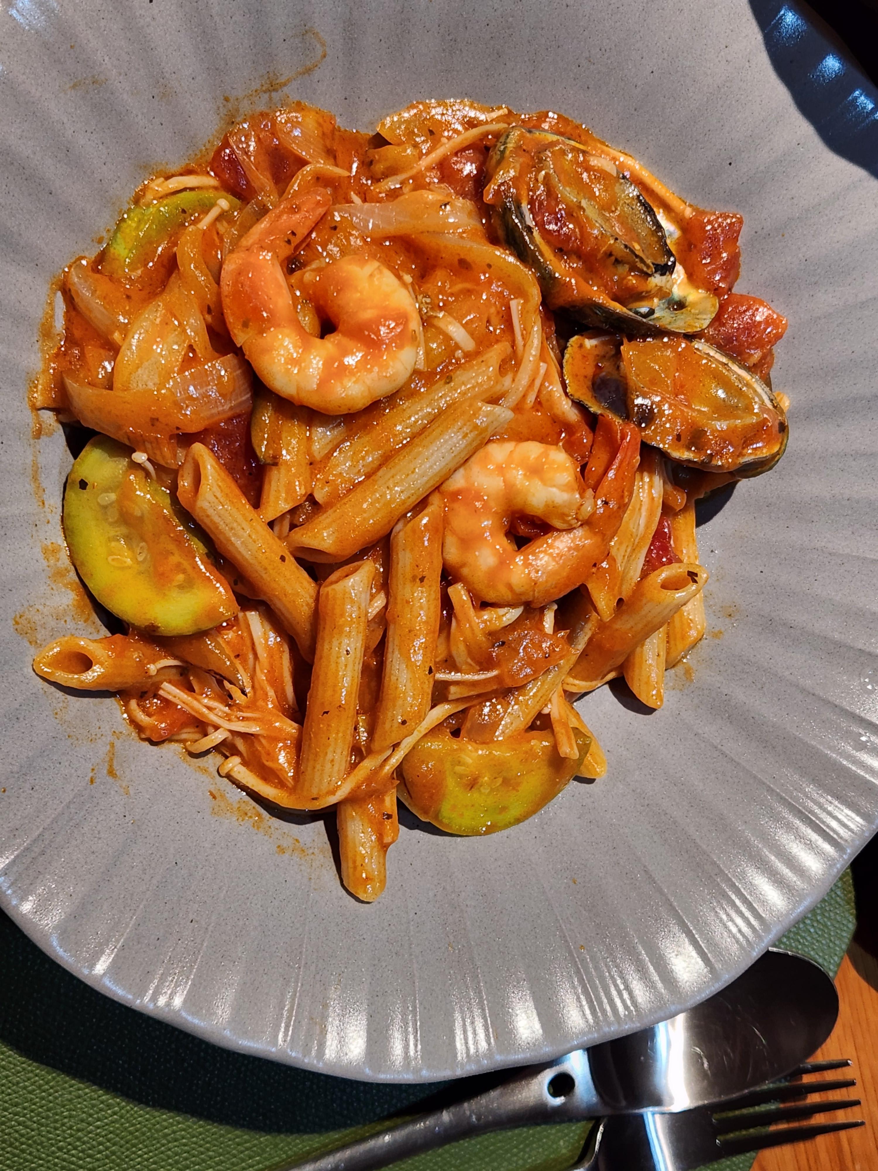 미주라 통밀펜네 파스타로 차린 한 상의 모습입니다.